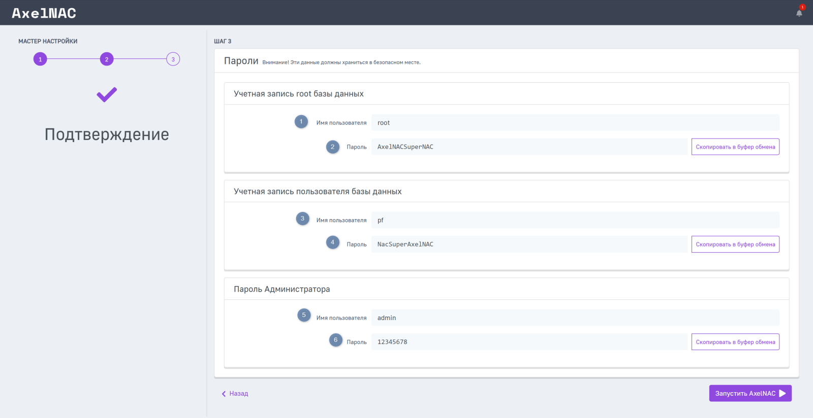 Сохраните указанные на странице пароли в надежном месте и запустите AxelNAC.