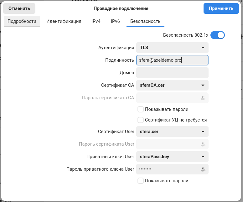 Шаг 8. Настройте соединение в окне NetworkManager: перейдите во вкладку Безопасность, активируйте переключатель Безопасность 802.1x и заполните поля следующим образом: