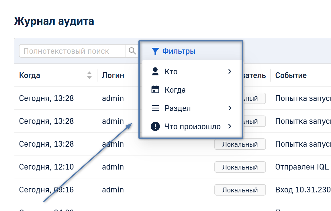 • Что произошло — фильтрация по типу действия, совершенному в Системе.