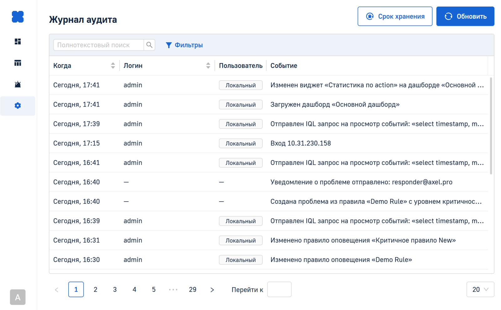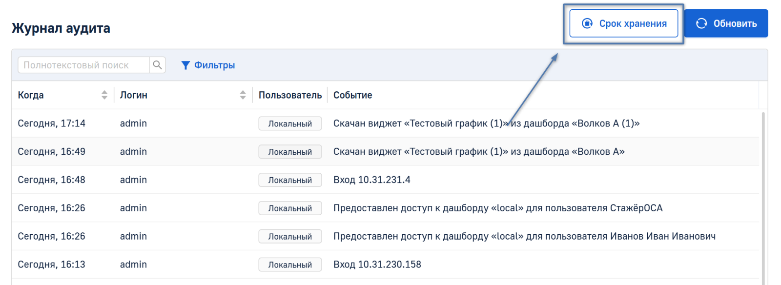 В данной статье описано взаимодействие с историей действий пользователей в Системе: как просмотреть и отфильтровать действия пользователей в Системе, а также описан процесс настройки длительности хранения записей в журнале.