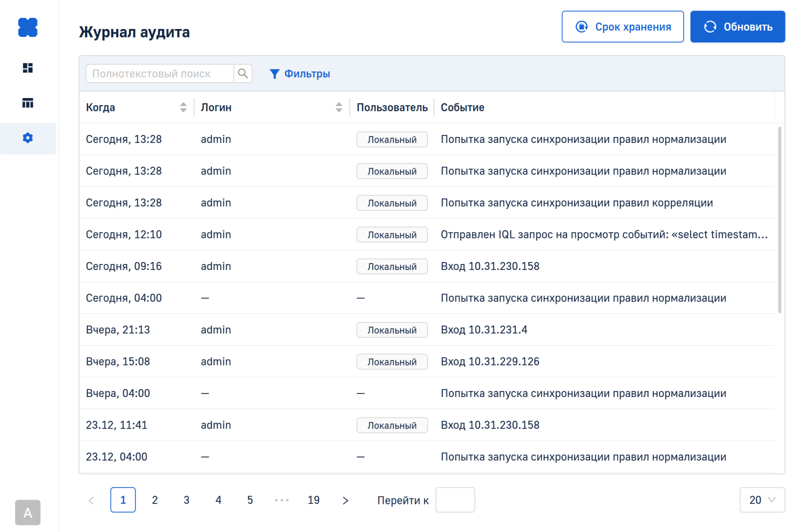 В данной статье описано взаимодействие с историей действий пользователей в Системе: как просмотреть и отфильтровать действия пользователей в Системе, а также описан процесс настройки длительности хранения записей в журнале.