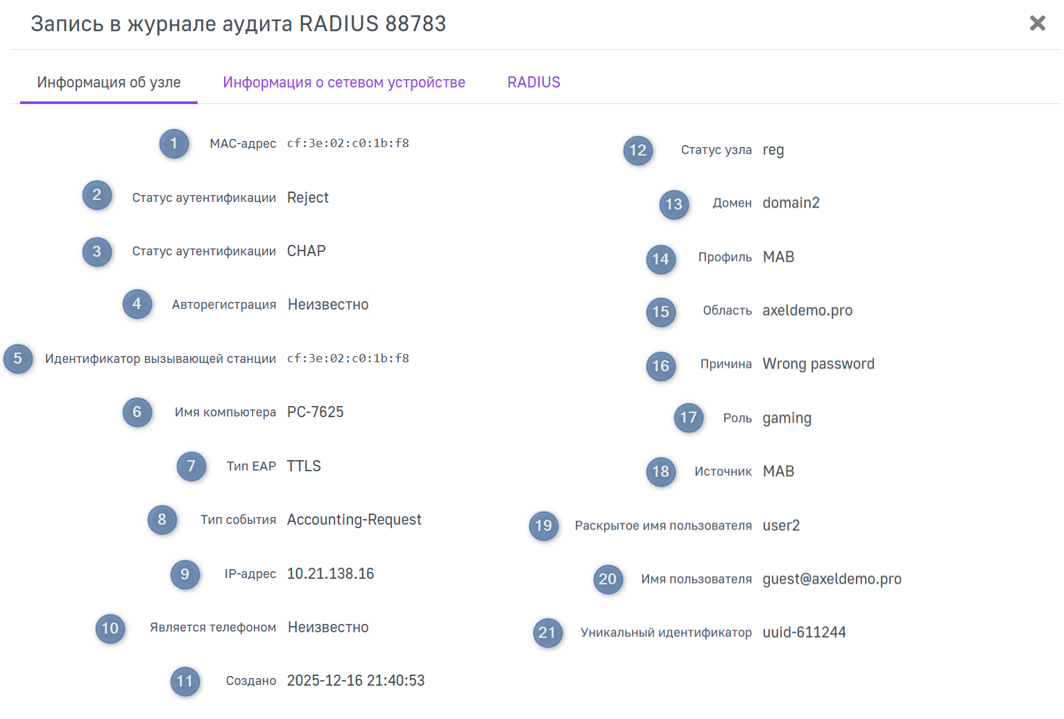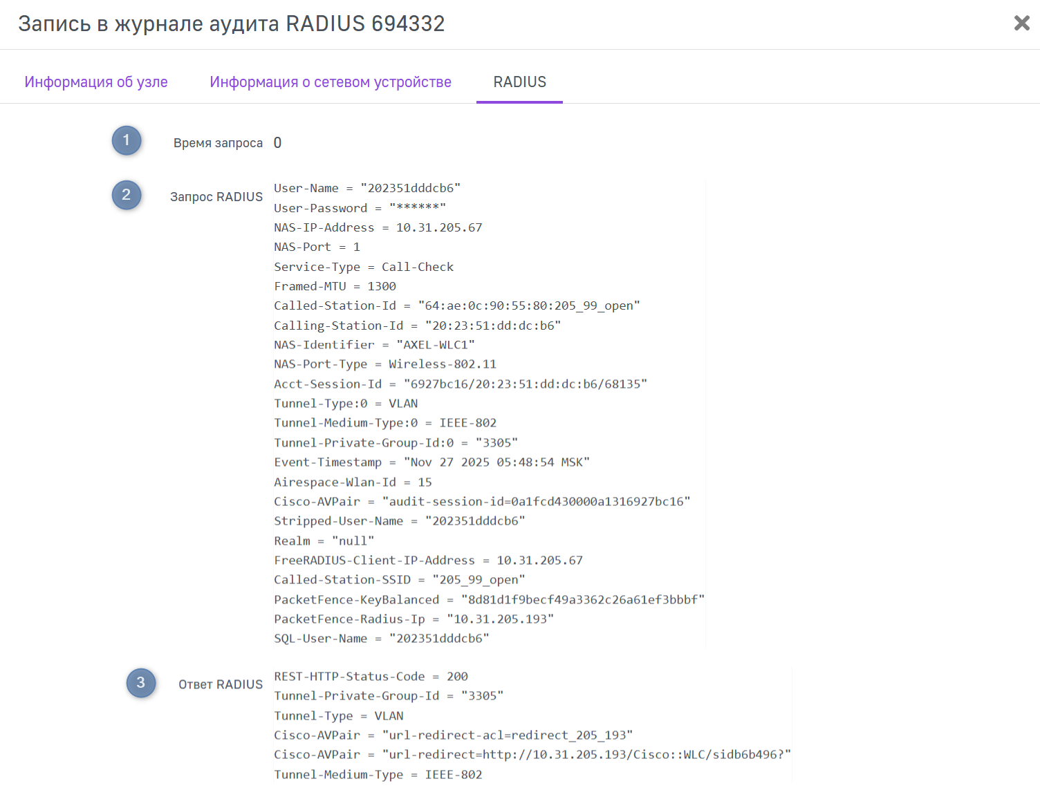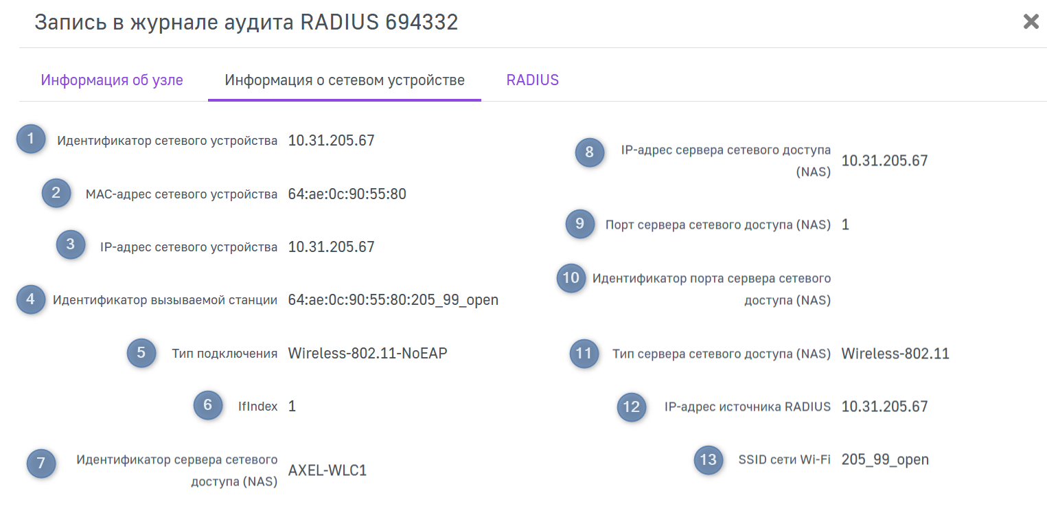 На данной странице отображаются подробные параметры выбранной записи в журналах аудита RADIUS.