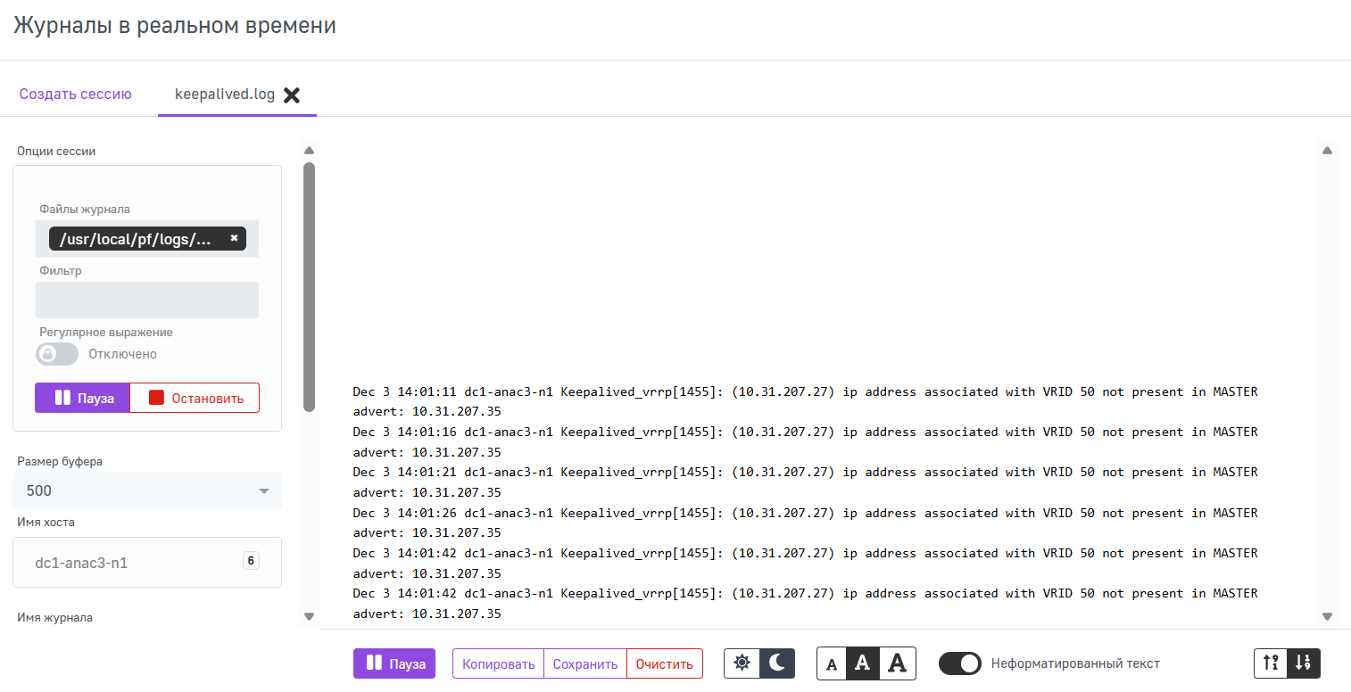 На данной вкладке отображается активная сессия мониторинга выбранных журналов в реальном времени. Интерфейс позволяет просматривать поступающие строки журнала, управлять отображением данных и применять различные фильтры.