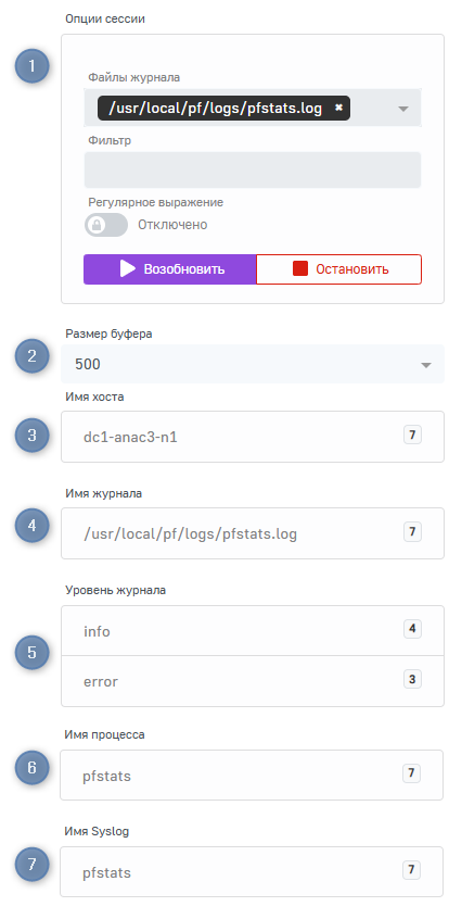 Рядом с параметрами Имя хоста, Имя журнала, Уровень журнала, Имя процесса и Имя Syslog отображается числовой индикатор, который показывает количество строк, содержащих конкретное значение параметра в данный момент. Вы можете отфильтровать записи по нужному параметру, для этого нажмите на соответствующее значение. Допускается выбор нескольких параметров одновременно, что позволяет комбинировать критерии фильтрации и уточнять результаты вывода.