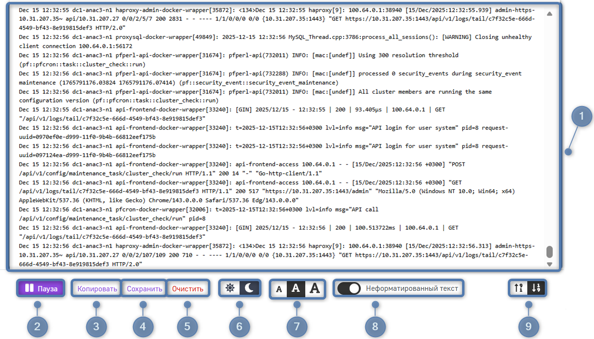 Область мониторингаПравая часть интерфейса является основной зоной сессии мониторинга. Здесь отображается поток строк журнала в реальном времени и расположены элементы управления выводом