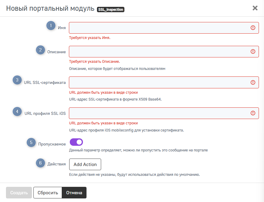 Для того чтобы создать новый модуль заполните параметры конфигурации и нажмите Создать. Чтобы сбросить введенные параметры на стандартные значения нажмите Сбросить. Для возвращения на предыдущую страницу без сохранения выполненных на странице действий нажмите Отменить.
