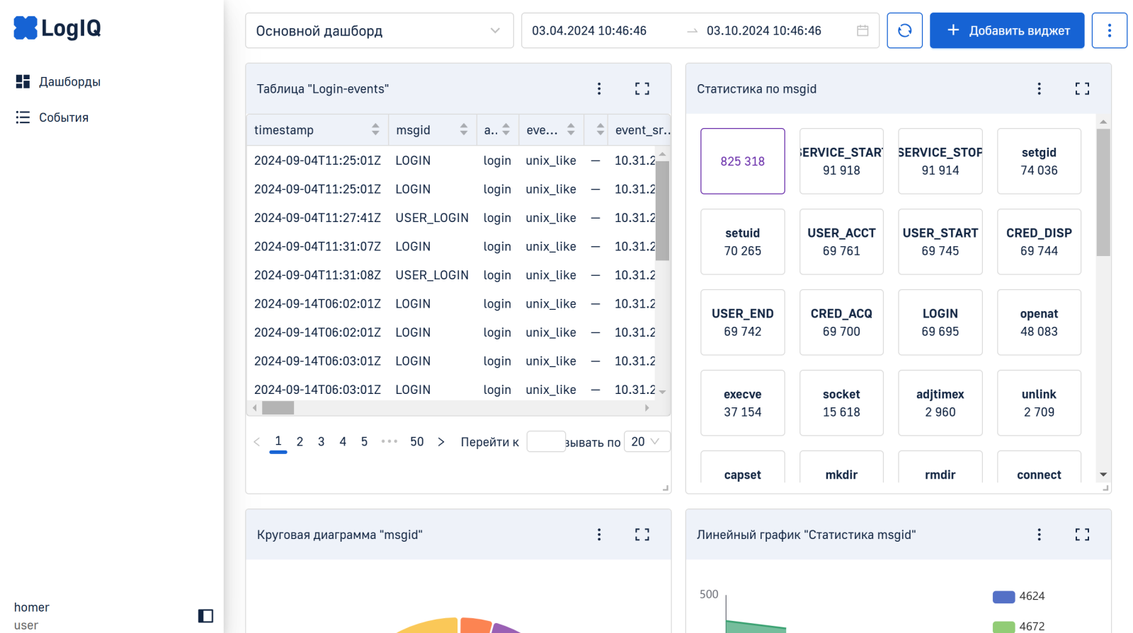 Страница Дашборды позволяет настраивать графическое представление выборки событий. Данная страница открывается автоматически после входа в систему, но также доступна из меню слева. На данной странице вы можете создавать, редактировать, импортировать/экспортировать и удалять дашборды и виджеты, а также просматривать историю пользовательских действий.