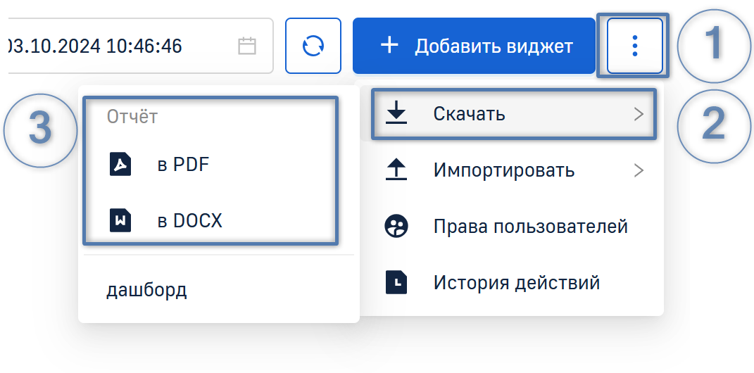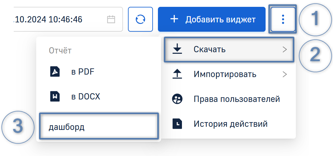 В открывшемся окне нажмите Добавить файлы и выберите файлы на вашем АРМ для загрузки. После того, как вы выбрали файлы для импорта, нажмите Импортировать. Импортированные дашборды автоматически добавятся в список дашбордов. При импорте дашборда не сохраняются права доступа к нему, а владельцем будет назначен пользователь, который выполнил импорт. Выгрузка дашбордовДля дашборда доступна выгрузка отчета в форматах PDF и DOCX. Чтобы скачать отчет, нажмите на три точки в правом верхнем углу страницы и в выпадающем списке выберите Скачать, затем выберите формат файла.