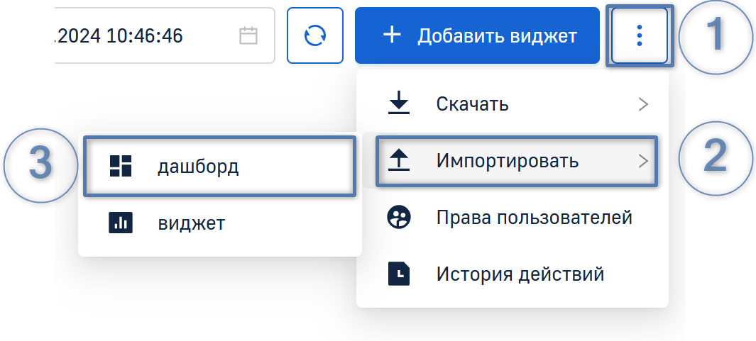 После этого выберите место на вашем АРМ для сохранения файла и нажмите Скачать. Импорт дашбордовДля того, чтобы импортировать дашборд в систему, нажмите на три точки в правом верхнем углу страницы и в выпадающем списке выберите Импортировать, затем дашборд.