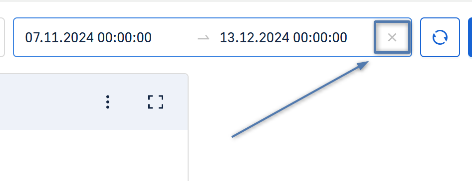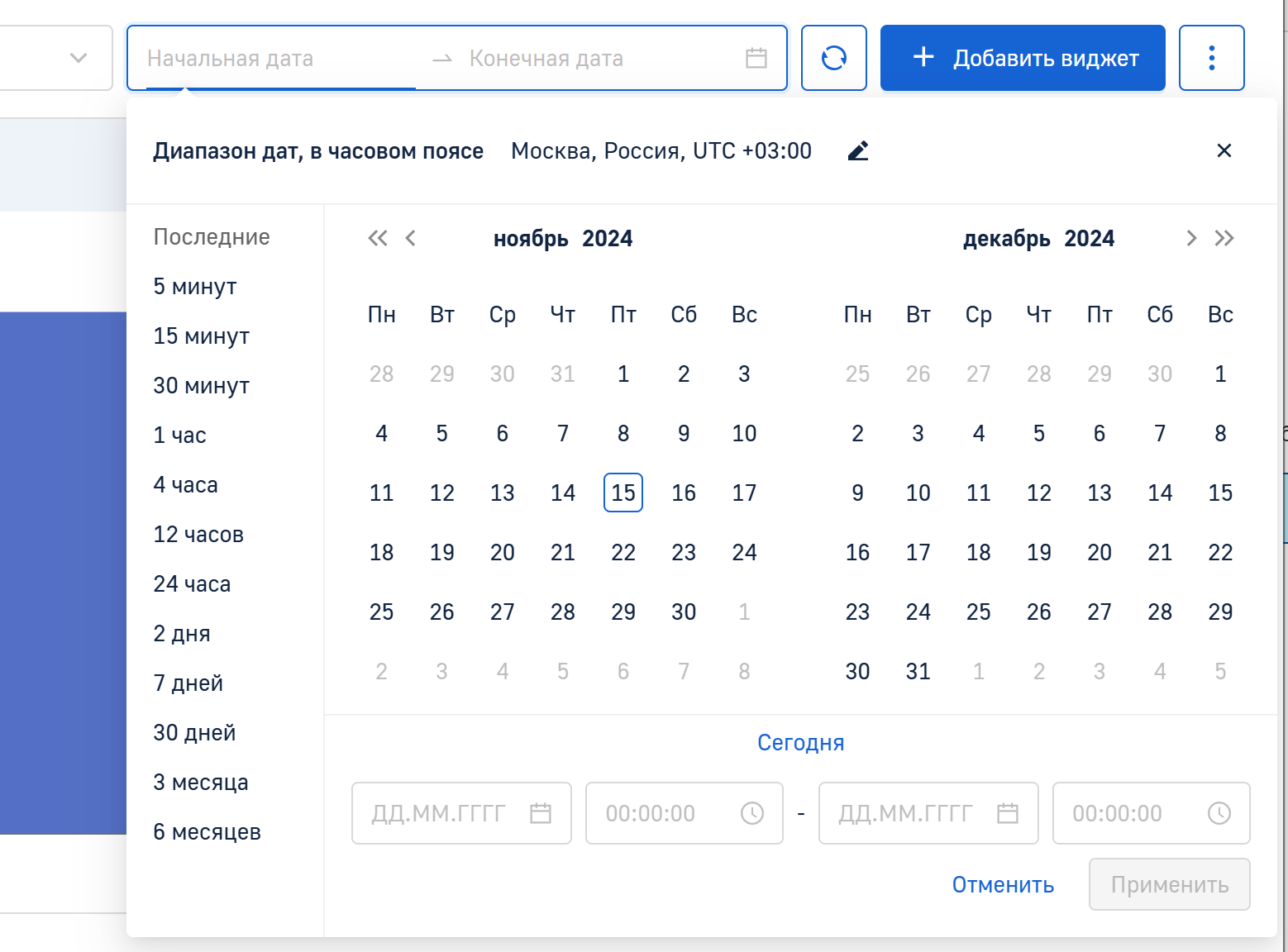 Для задания временного промежутка вы можете указать точные дату и время, либо выбрать один из предустановленных временных интервалов. Чтобы применить временной промежуток нажмите Применить. Для того, чтобы сбросить выборку по временному промежутку, нажмите X справа от строки выбора даты: