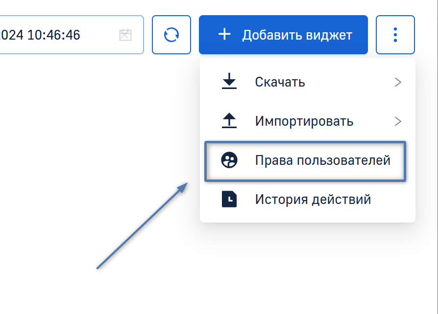 Настройка доступа к дашбордуДля предоставления другим пользователям доступа к дашборду нажмите на три точки в правом верхнем углу страницы и в выпадающем списке выберите Права пользователей.