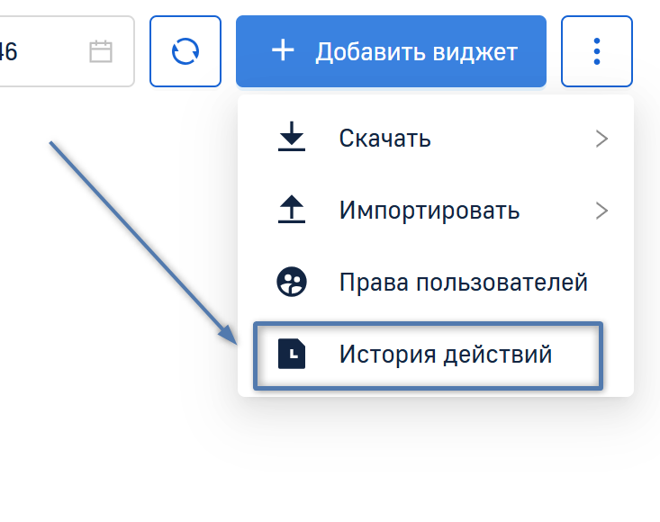 Просмотр измененийДля перехода на страницу истории изменений дашборда нажмите на три точки в правом верхнем углу страницы и в выпадающем списке выберите История действий.