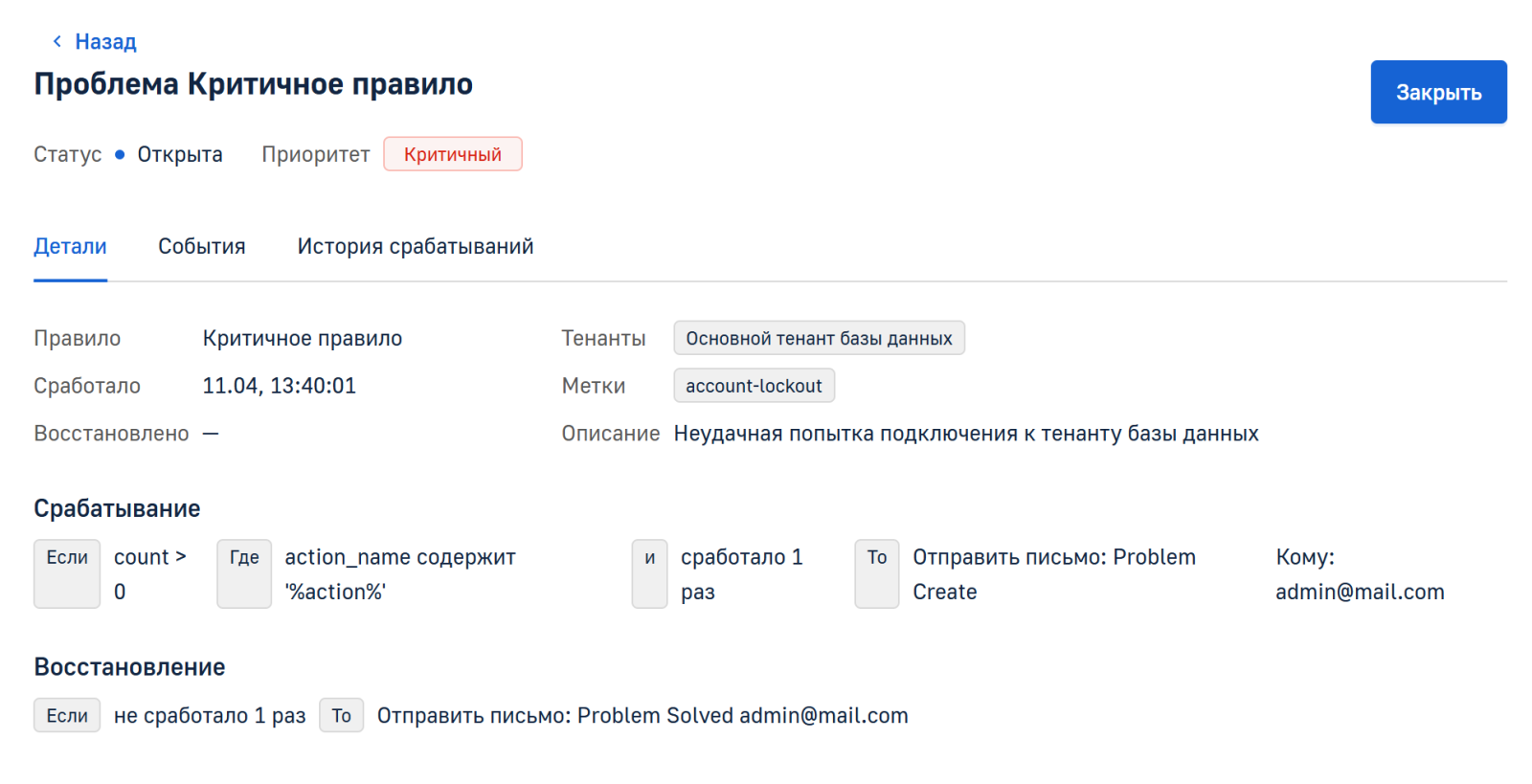 При открытии оповещения будет автоматически открыта вкладка Детали, на которой вы можете просмотреть подробные данные об этом оповещении: