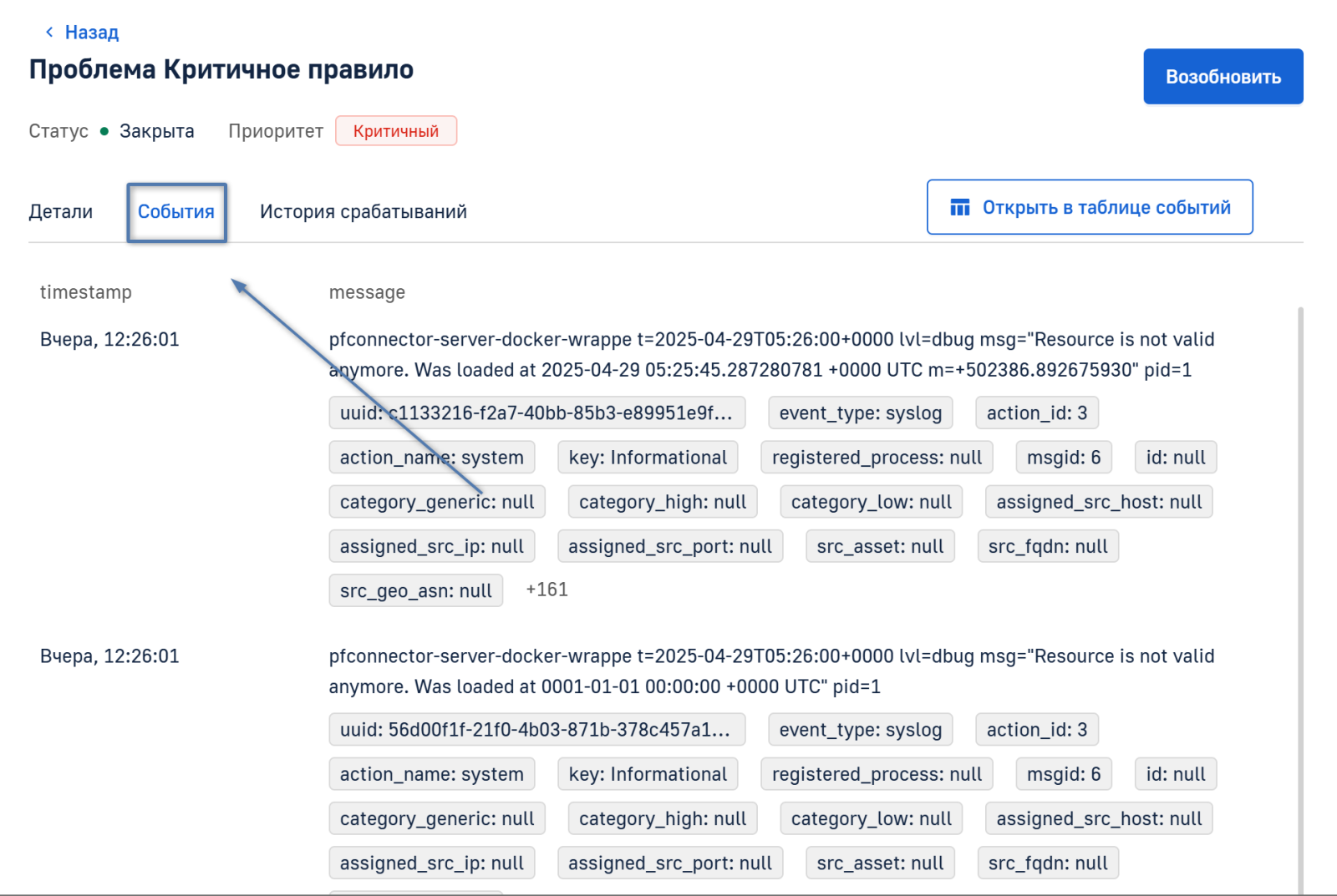 Для того, чтобы просмотреть все события, связанные с данным оповещением, перейдите на вкладку События.