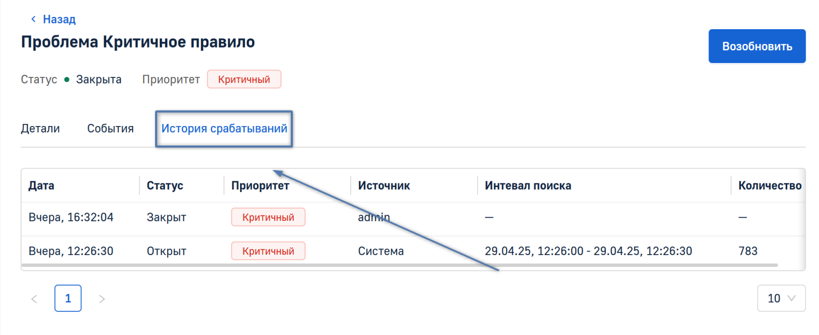 Для того, чтобы просмотреть историю изменения статуса оповещения, перейдите на вкладку История срабатываний.
