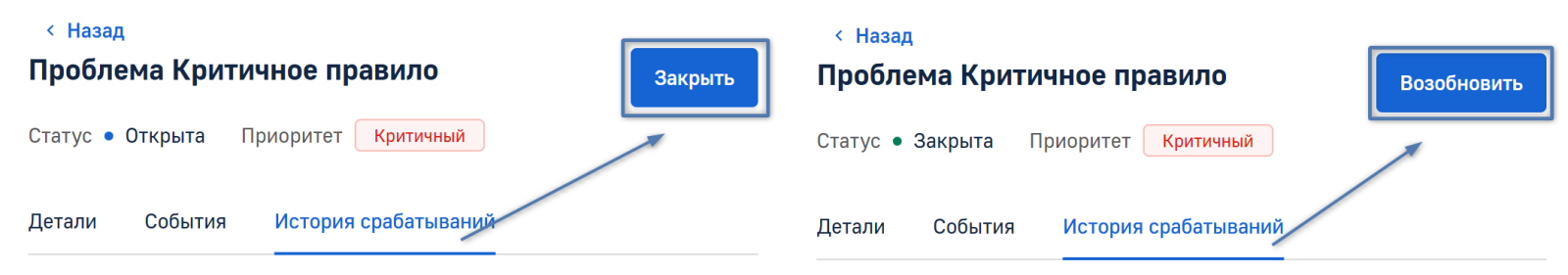 Для того, чтобы вручную изменить статус оповещения нажмите Возобновить или Закрыть в правом верхнем углу страницы: