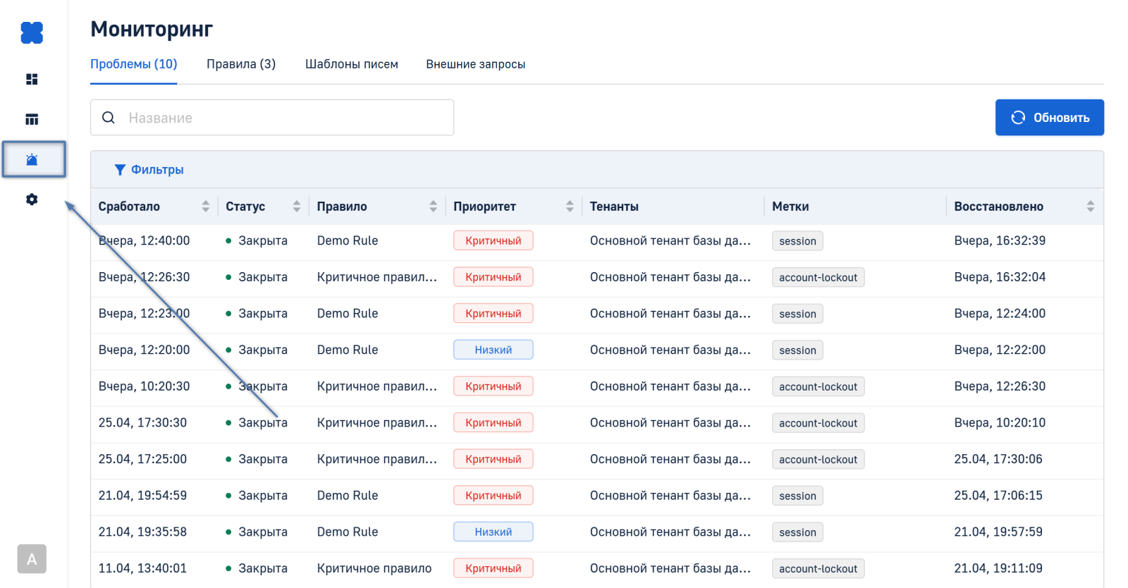 Для просмотра оповещений необходимо перейти на вкладку Мониторинг → Проблемы.
