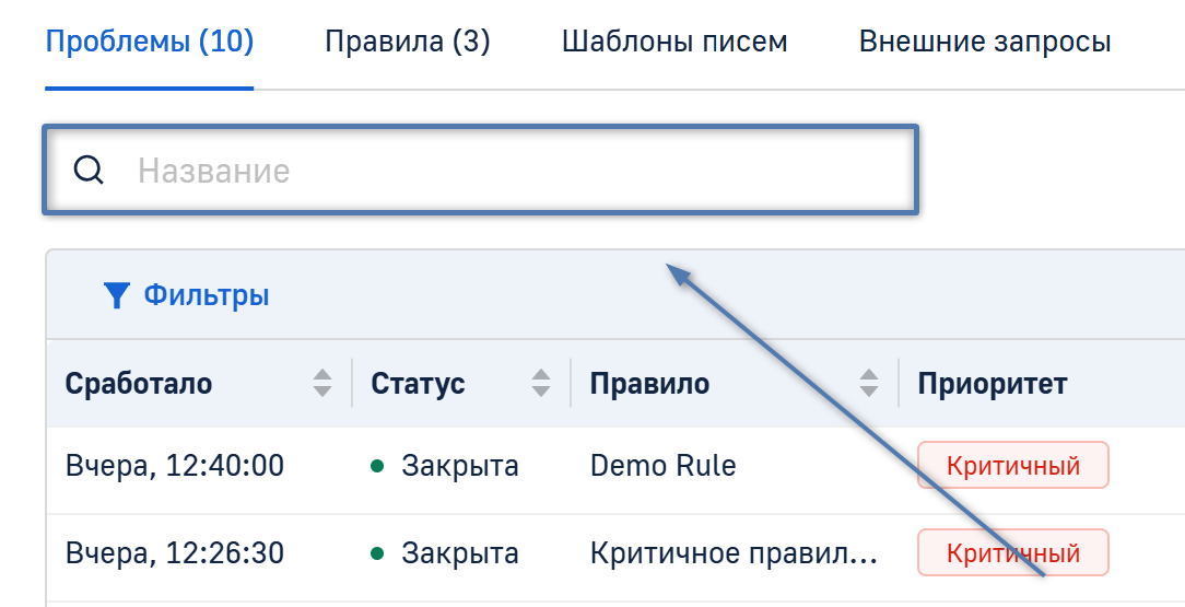 Для того, чтобы найти определенное оповещение в списке, нажмите на форму поиска в левом верхнем углу таблицы и введите ключевое слово.