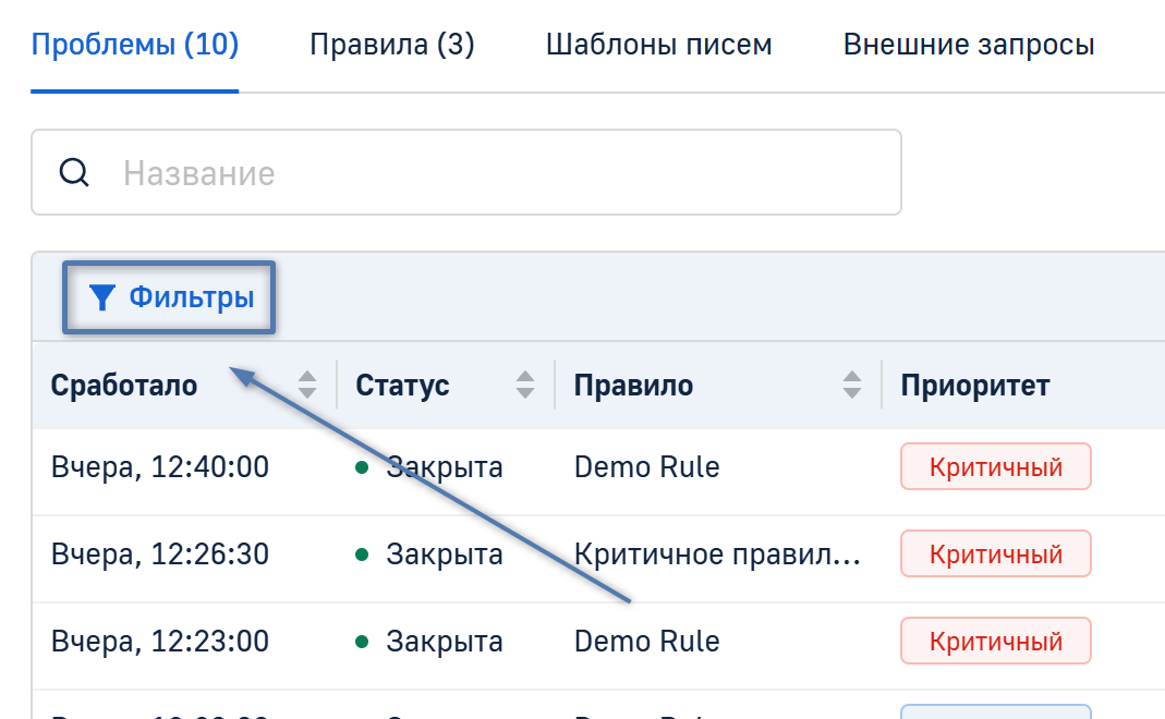 Вы также можете отфильтровать список оповещений по статусу, приоритету, тенанту, меткам и правилам. Для этого нажмите на иконку фильтра и выберите параметры для фильтрации списка.