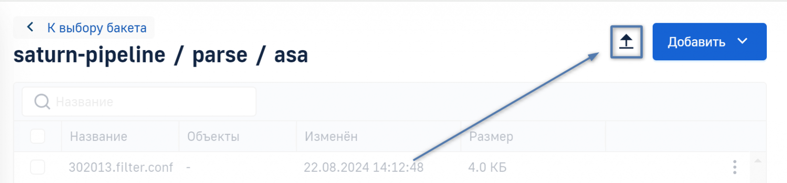 Для того, чтобы загрузить файл в бакет, нажмите на иконку загрузки в правом верхнем углу страницы.