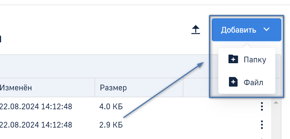 Для того, чтобы создать файл или папку, нажмите Добавить в правом верхнем углу страницы и выберите из выпадающего списка элемент, который вы бы хотели создать.