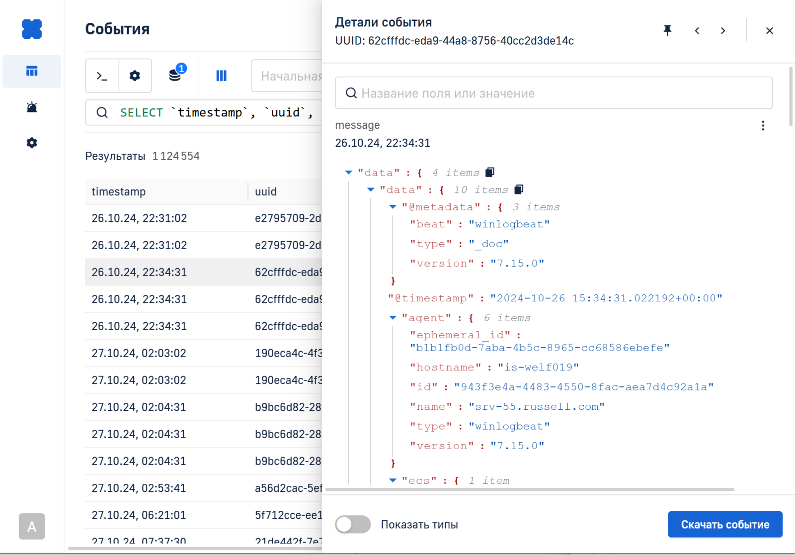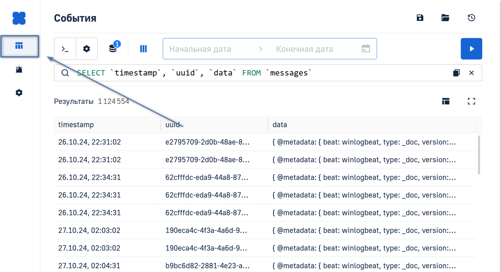 В данной статье описана работа с событиями в формате JSON: как просматривать и фильтровать такие события, а также сохранять запросы фильтрации. Режим просмотра JSON-событий активируется с помощью внесения изменений в конфигурационные файлы системы. Подробное описание процесса описано в Руководстве разработчика. Раздел События позволяет формировать запрос на выборку cобытий в формате JSON. Для перехода в раздел нажмите на иконку События в левом боковом меню.