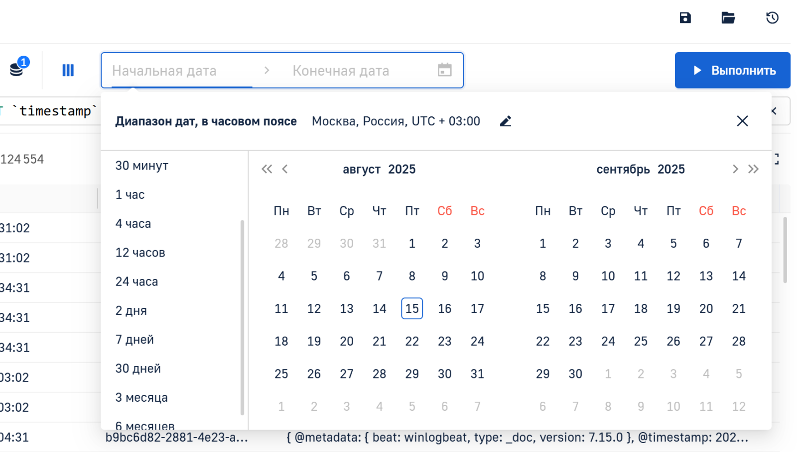 Определение временных рамокДля того, чтобы отфильтровать список событий по времени их регистрации, нажмите на поле выбора даты, расположенное в верхнем левом углу страницы. В модальном окне вы можете ввести диапазон дат и времени вручную, либо выбрать одно из предустановленных значений.