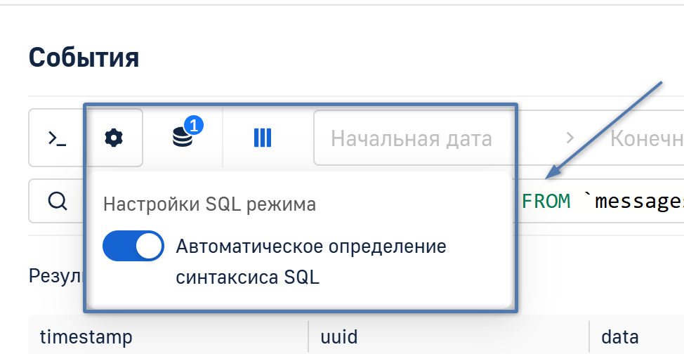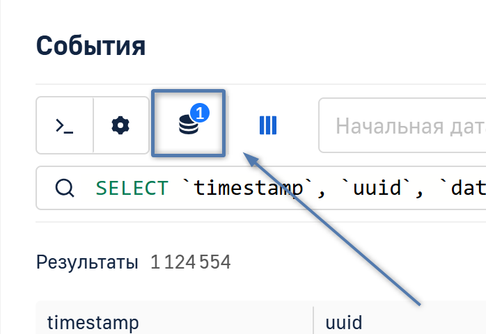 После того как вы выбрали временной диапазон, нажмите Обновить, чтобы обновить список событий. Поле ввода SQL-запросаДля того, чтобы отфильтровать, отсортировать или сгруппировать события, вы можете отредактировать исходный SQL-запрос. При вводе SQL-запроса необходимо соблюдать следующие правила:
