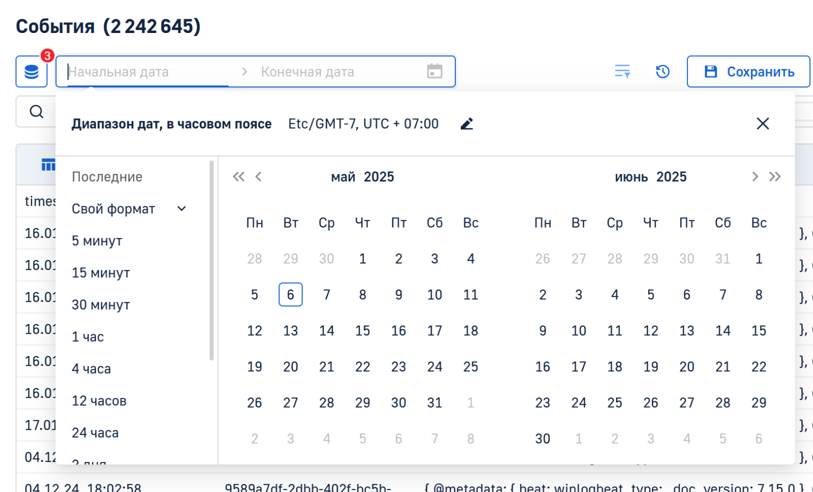 Определение временных рамокДля того, чтобы отфильтровать список событий по времени их регистрации, нажмите на поле выбора даты, расположенное в верхнем левом углу страницы. В модальном окне вы можете ввести диапазон дат и времени вручную, либо выбрать одно из предустановленных значений.
