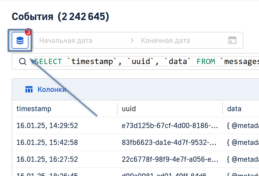 После того как вы выбрали временной диапазон, нажмите Обновить, чтобы обновить список событий. Поле ввода SQL-запросаДля того, чтобы отфильтровать, отсортировать или сгруппировать события, вы можете отредактировать исходный SQL-запрос. При вводе SQL-запроса необходимо соблюдать следующие правила: