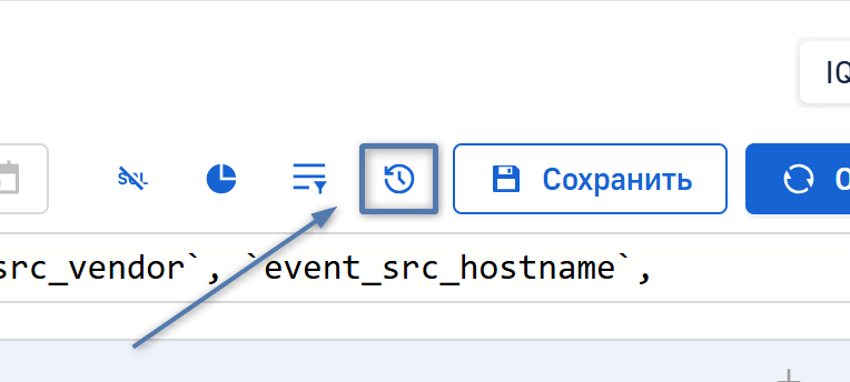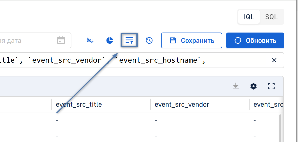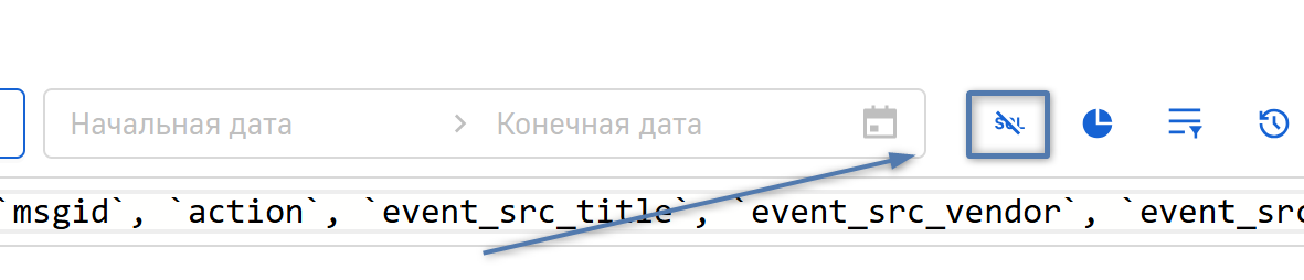 Для того, чтобы скрыть/отобразить поле для ввода SQL-запроса, нажмите на иконку SQL справа от поля выбора фильтрации по дате..