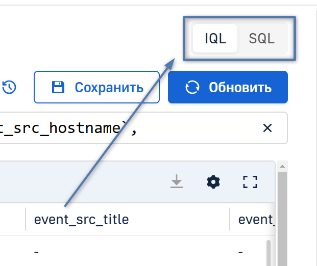 Вы также можете переключаться между режимами запросов: IQL (базовый режим) и SQL (расширенный режим). Для этого нажмите на переключатель языков в правом верхнем углу страницы.