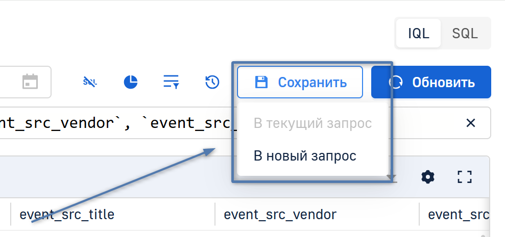 Вы можете экспортировать не более 1 миллиона событий за раз. Сохраненные запросыСохранение запросовДля удобства ежедневного использования вы можете сохранить ваши запросы и фильтры. Для этого нажмите Сохранить в правом верхнем углу страницы, затем в выпадающем меню выберите вариант сохранения — в текущий запрос, или в новый.