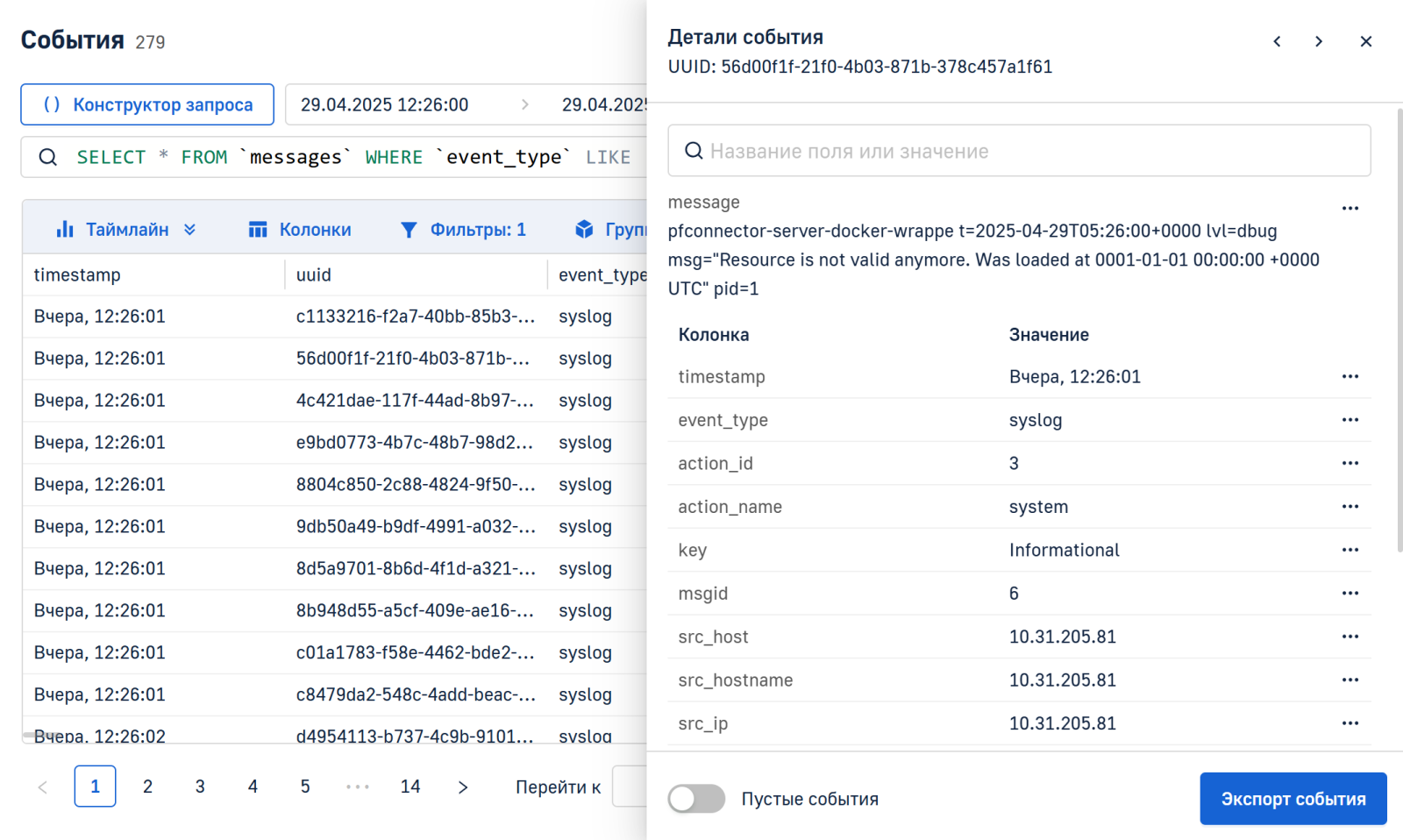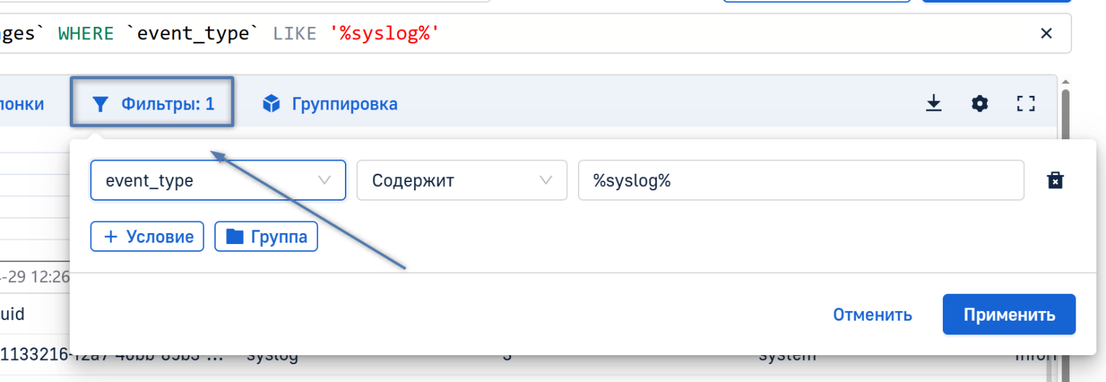 Нажмите Применить для сохранения фильтра, затем обновите список событий, нажав Обновить. Поле ввода SQL-запросаПри необходимости, вы можете ввести SQL-запрос вручную. Для этого нажмите на поле ввода SQL-запроса и отредактируйте его содержимое под свои нужды.