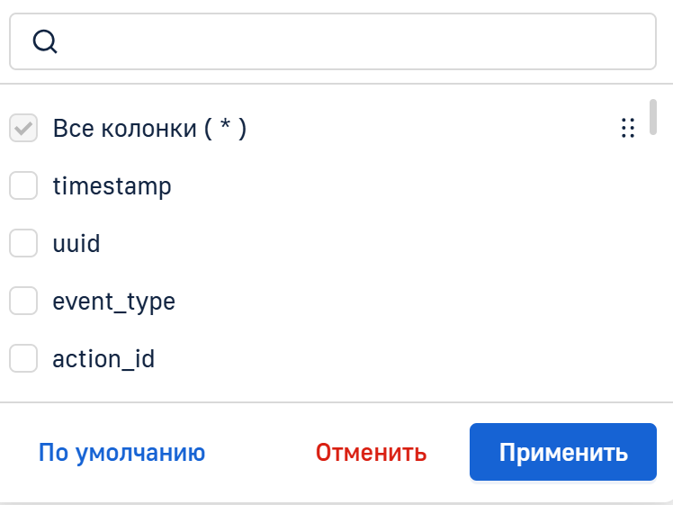 Для того, чтобы увеличить масштаб временной шкалы нажмите и удерживайте левую кнопку мыши и выделить отрезок, который необходимо отобразить более детально. Чтобы вернуться к общему виду нажмите Предыдущий период. Сортировка таблицыДля упрощения навигации по списку, вы можете выбрать список и порядок отображаемых колонок. Для этого нажмите Колонки в левом верхнем углу таблицы. Используйте переключатель слева от имени поля, для того, чтобы включить или выключить отображение колонки в таблице. По умолчанию выбраны первые 8 полей. Для того, чтобы изменить порядок отображения колонок, наведите курсор на иконку сортировки справа от имени колонки, зажмите левую кнопку мыши и перенесите элемент в необходимое место.
