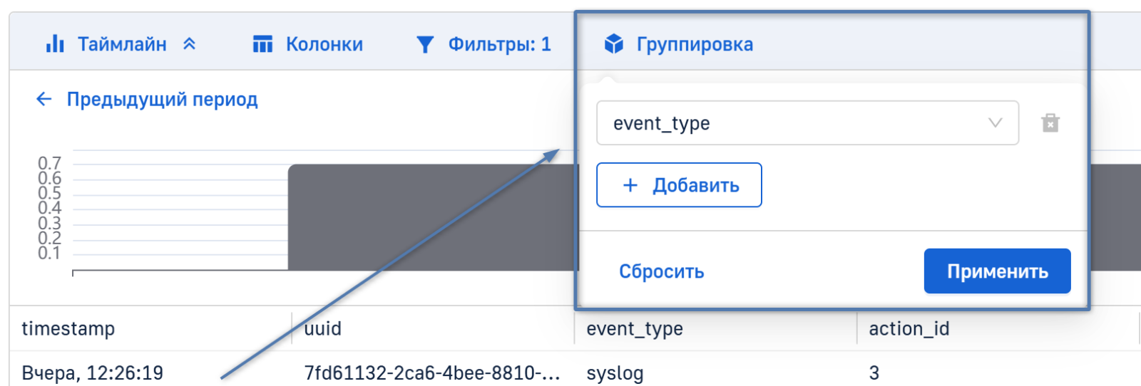 Группировка событийДля того, чтобы сгруппировать события по определенному полю, нажмите Группировка и выберите поле/поля для группировки. После нажатия Применить, сгруппированные события отобразятся в дополнительной таблице, слева от основной.