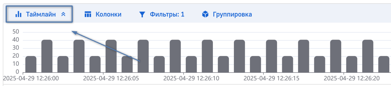 После того как вы дополнили фильтр, нажмите Обновить, чтобы обновить список событий. Просмотр таймлайна событийФункционал системы позволяет просмотреть распределение событий по временной шкале. Для просмотра, нажмите Таймлайн в левом верхнем углу таблицы.