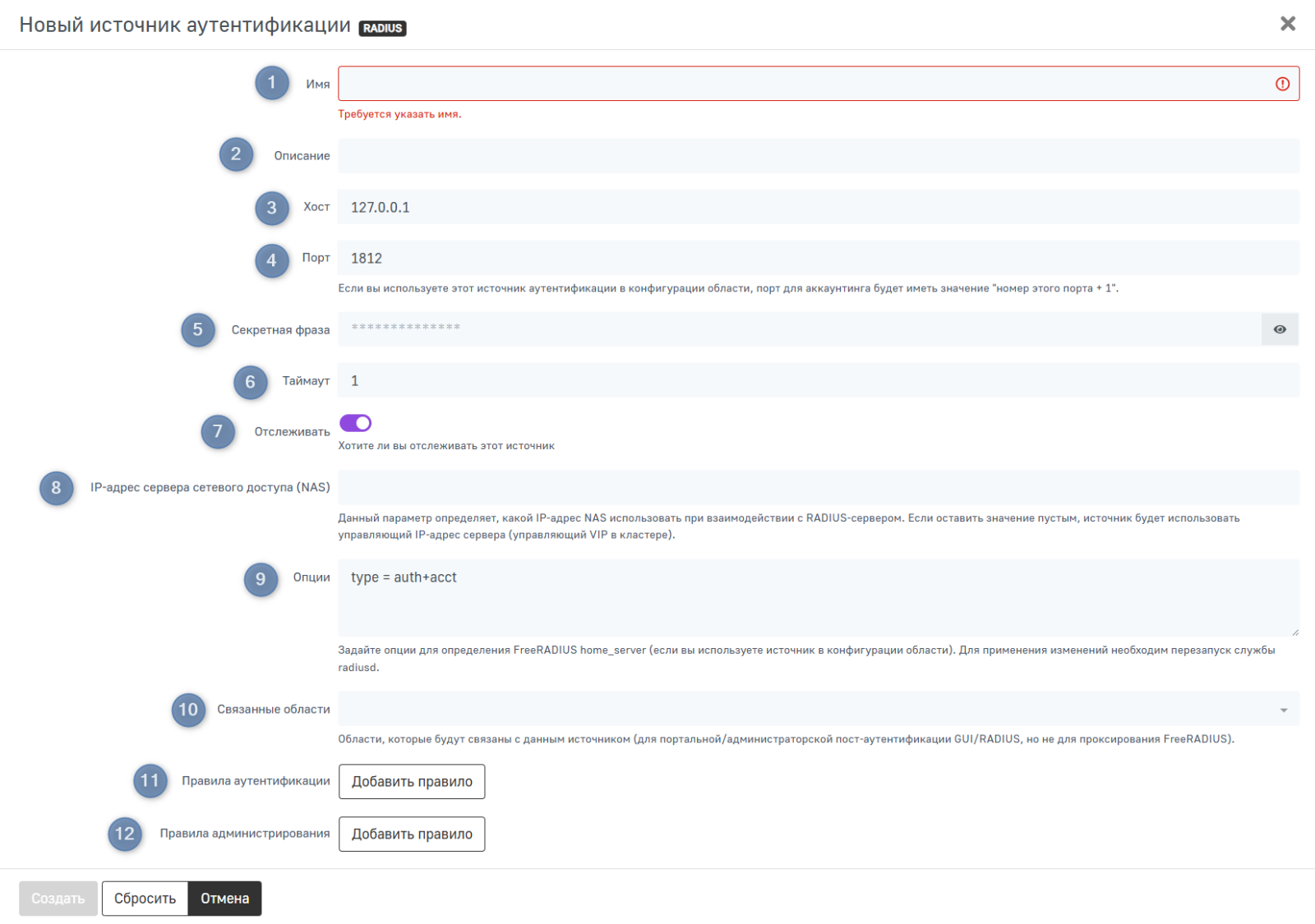 Создание нового источника аутентификации RADIUS