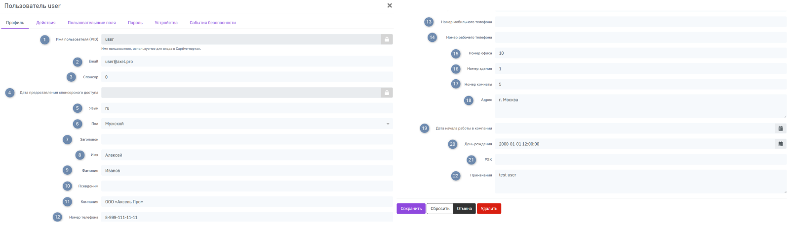 22. Примечания — текстовое поле для любых дополнительных сведений, связанных с пользователем.