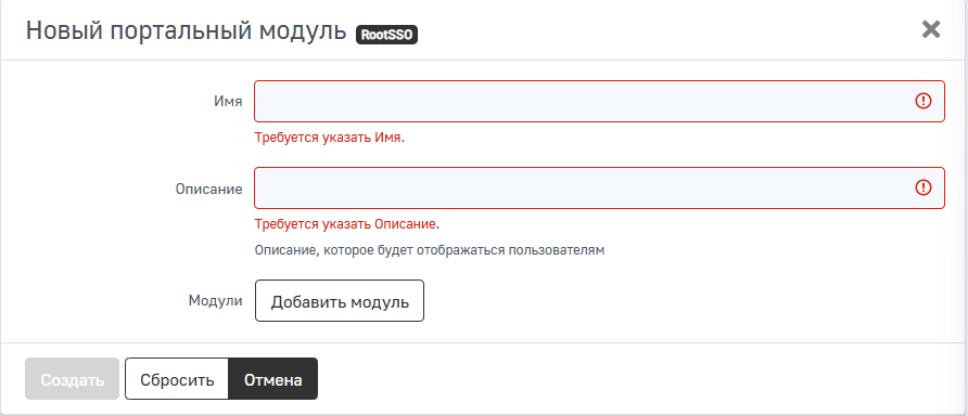 Для того чтобы создать новый корневой модуль с типом RootSSO, нажмите Новый корневой модуль в правом верхнем углу страницы и в выпадающем списке выберите RootSSO. После этого откроется меню конфигурации нового модуля.