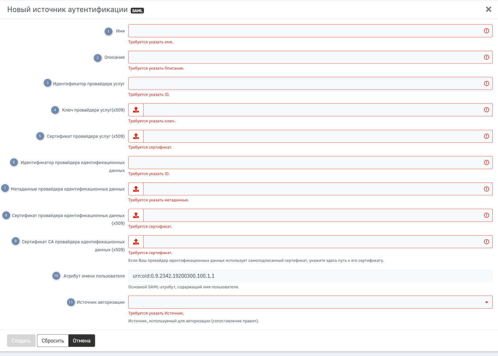 1. Имя — имя источника аутентификации, которое будет отображаться в таблице со списком всех источников аутентификации. Задается при создании источника и не может быть изменено в дальнейшем;