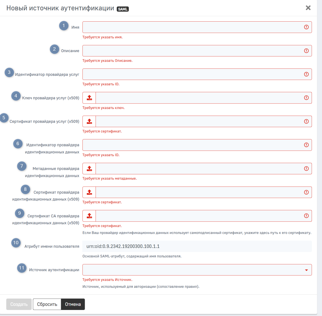 - Имя — имя источника аутентификации, которое будет отображаться в таблице со списком всех источников аутентификации. Задается при создании источника и не может быть изменено в дальнейшем;