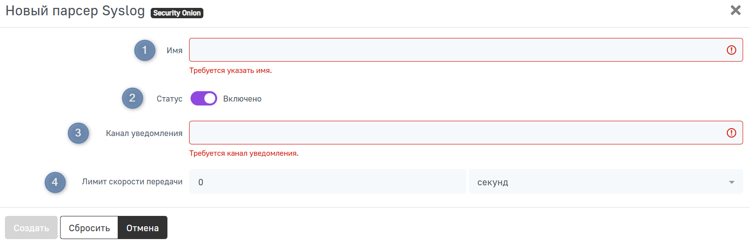 Для настройки парсера Security Onion перейдите в раздел Конфигурация → Интеграция → Парсеры Syslog → Новый парсер Syslog и выберите значение Security Onion в выпадающем списке.