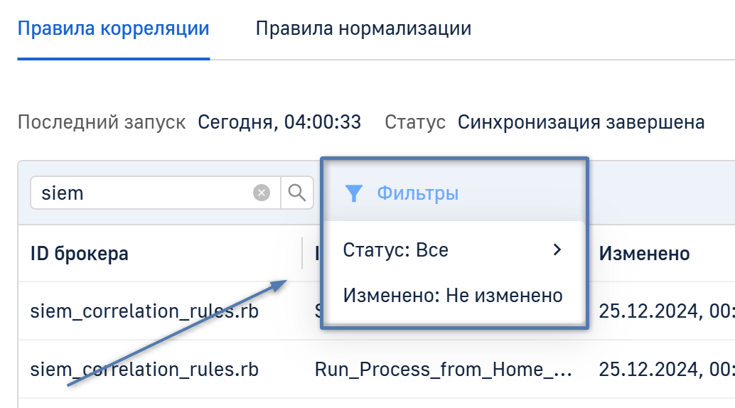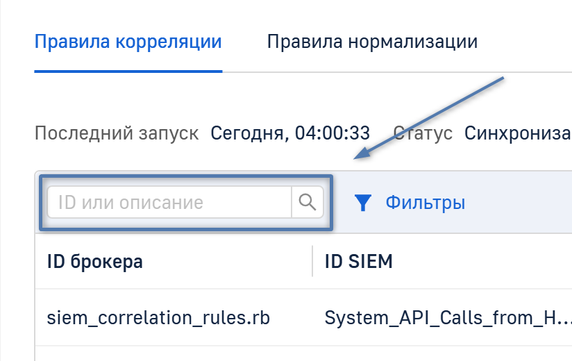 Выполнение синхронизации правил корреляции происходит автоматически раз в сутки, однако администратор может запустить синхронизацию в ручном режиме.