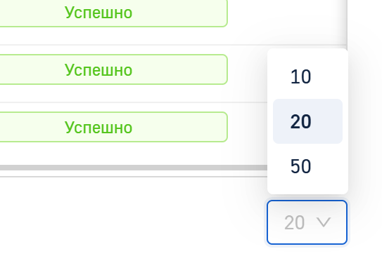По умолчанию, на странице отображается до 20 записей. Для того, чтобы увеличить число отображаемых записей на странице, нажмите на количество записей в правом нижнем углу страницы и выберите одно из значений: