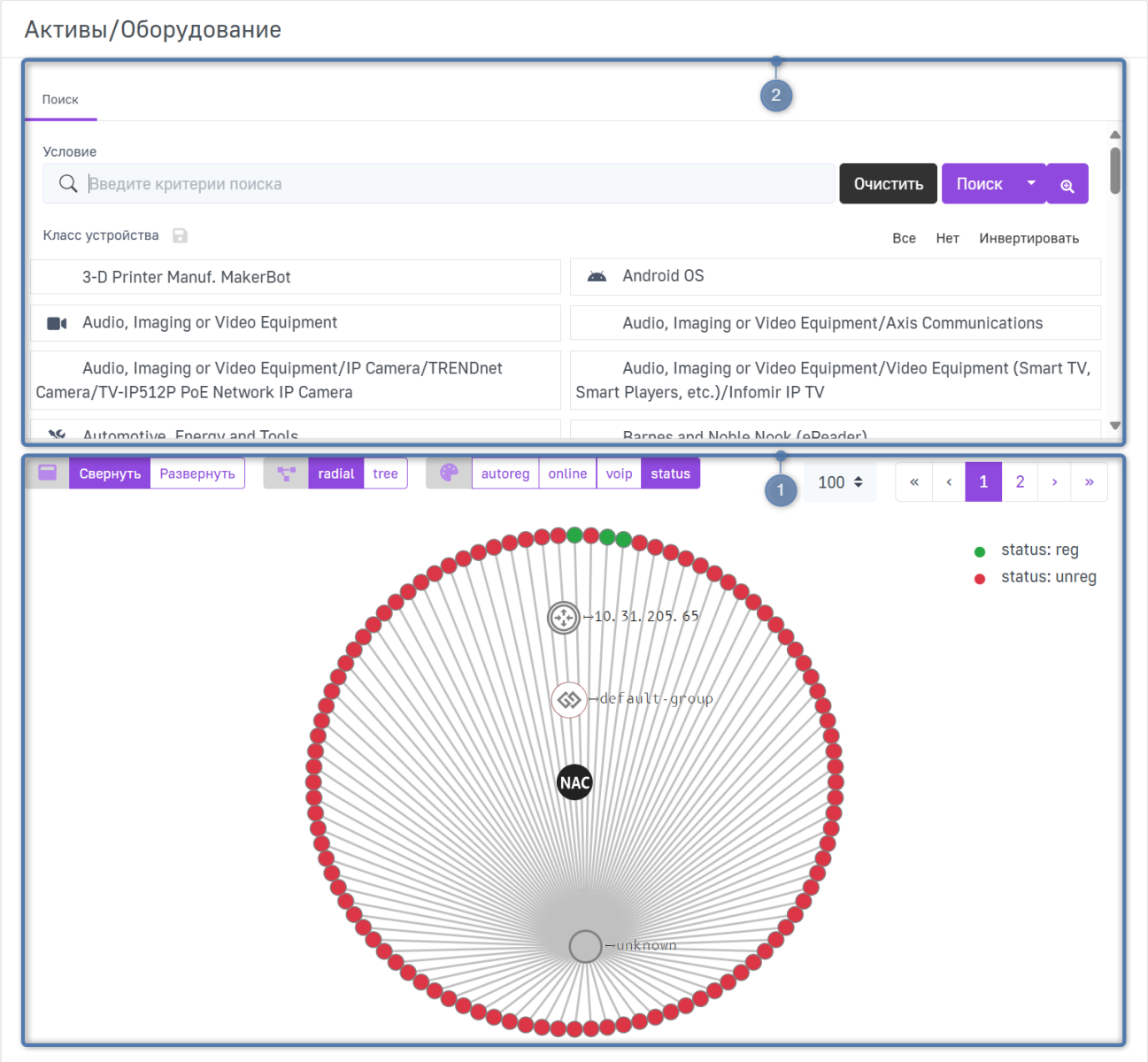Страница Активы/Оборудование предназначена для визуального контроля подключенных к сети устройств и анализа их текущего состояния.