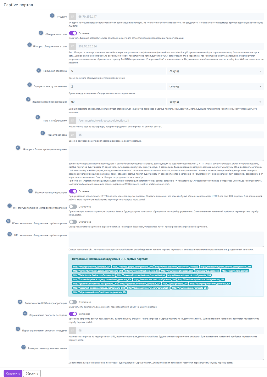 URL механизма обнаружения Captive-портала — список известных URL, которые используются устройствами для обнаружения наличия Captive-портала и активации механизма Captive-портала, разделенный запятыми;
