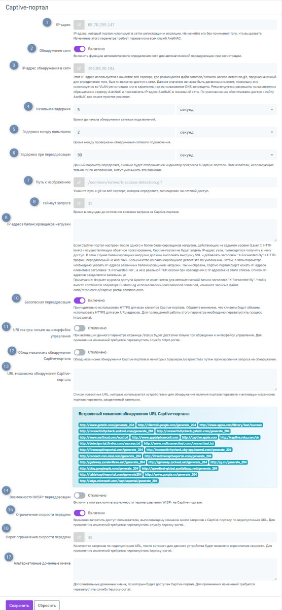 URL механизма обнаружения Captive-портала — список известных URL, которые используются устройствами для обнаружения наличия Captive-портала и активации механизма Captive-портала, разделенный запятыми;