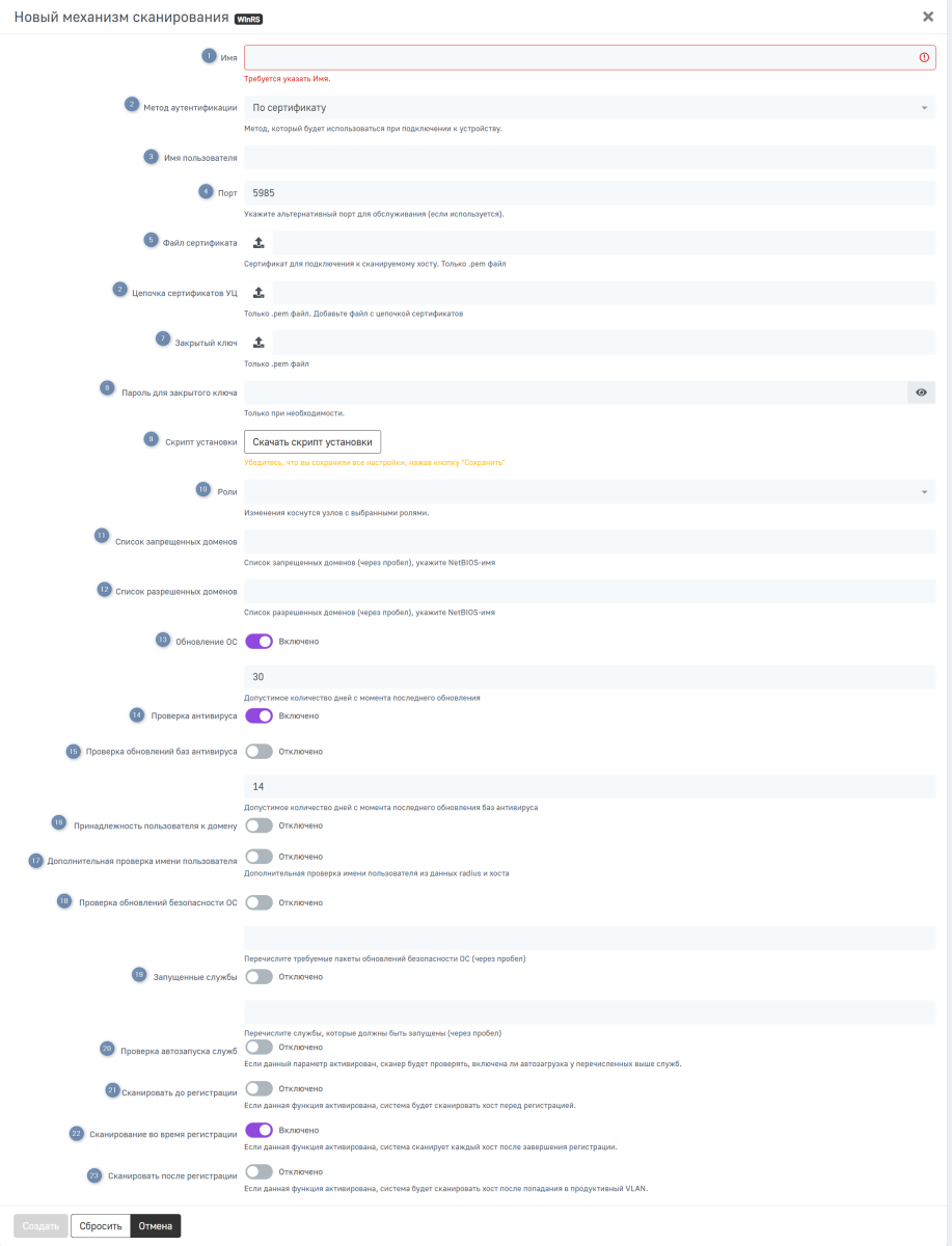 Для того чтобы создать новый механизм сканирования, нажмите Новый механизм сканирования в левом верхнем углу страницы и выберите WinRS в выпадающем списке.