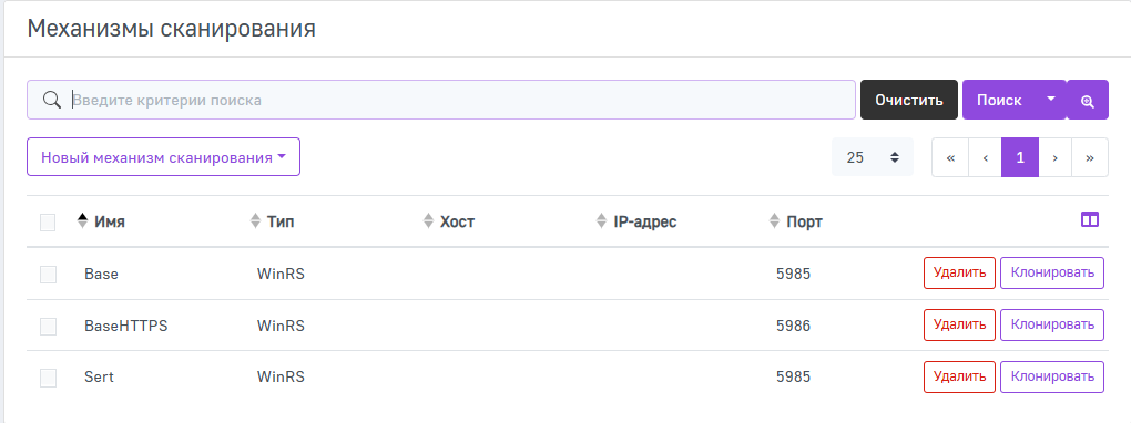 Для того чтобы найти определенный механизм сканирования, можно выполнить поиск по критериям: Имя, Тип, Хост, IP-адрес и Порт. Введите интересующий критерий в поле поиска и нажмите Поиск. Нажмите Очистить, чтобы сбросить критерии поиска.